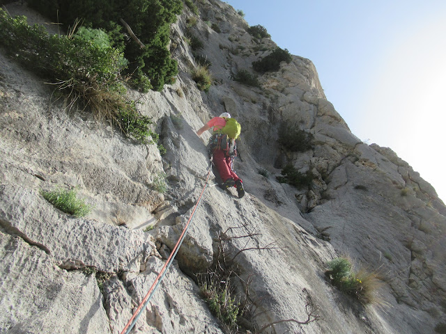 Ya le tenia yo ganas a esta vía, la he visto en varios Blog y cuando hice la vía "América" también le vi los químicos relucientes... Decir que la vía "Desidia" 6a / 185m. esta equipada con químicos, en reuniones y en los largos, pero hace falta un juego de friends y empotradores, para proteger los alejes entre seguros que están bastante largos y una chapa recuperable para el primer largo si queremos asegurarnos del buril sin chapa que hay.
