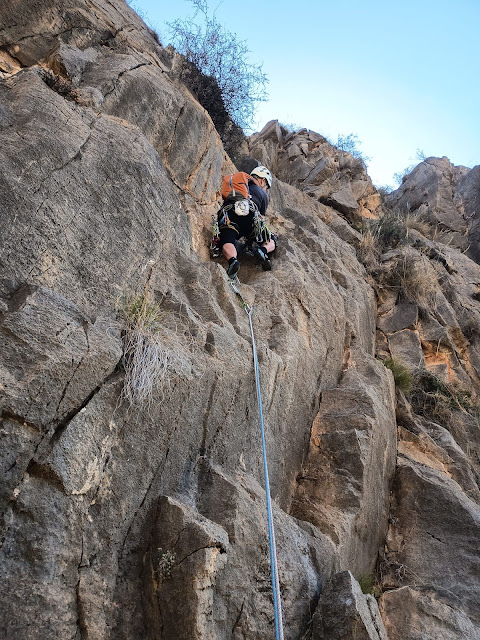 Segundo largo Vº: Sale Javi por la derecha de la reu, tramo con mucho canto y muy buena roca, que nos lleva hacia un muro vertical y donde nos tendremos que mover bien a derechas y a izquierdas, para sortear esta tramo final, que nos deja en la repisa del poeta, donde esta la reunión con un parabolt y un puente de roca.